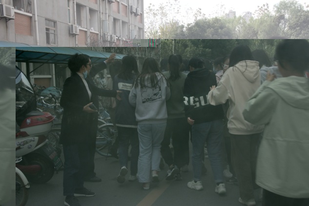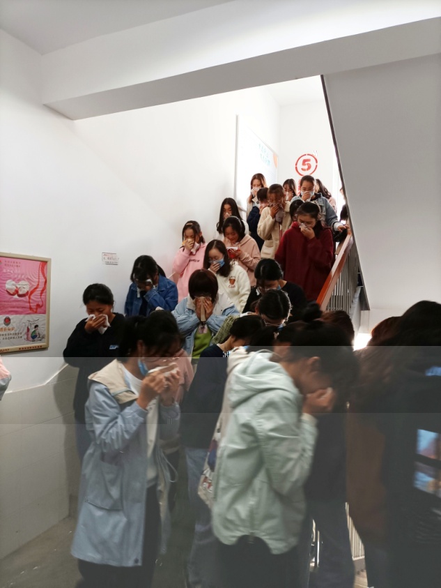 三聲哨響,房門立刻被敲響,各樓層負責人安排在寝學生進行安全有序撤離。