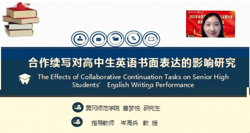 曹夢悅以“合作續寫對高中生英語書面表達的影響研究”為題目參加了“基礎教育教學測試研究”組的研讨。曹夢悅從研究背景、研究目的及意義、研究方法以及研究過程四個方面詳細闡述了論文設計,并與參會的專家老師、研究生同學們進行了深入地探讨,獲得了點評專家的悉心指導與認可。