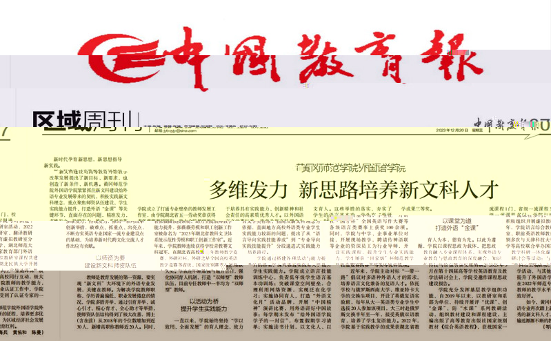 《中國教育報》12月20日第07版(區域周刊)以《多維發力 新思路培養新文科人才》為題,報道3044am永利集团3044noc積極實踐新文科理念,重點聚焦師資隊伍建設、學生實踐能力提升、打造外語“金課”等關鍵環節,直面存在的問題,精準發力,多維發力,持續發力,推出一系列改革創新舉措,破難點、抓重點、出亮點,不斷夯實英語專業國家一流專業建設點的基礎,為培養新時代跨文化交流人才作出應有貢獻。