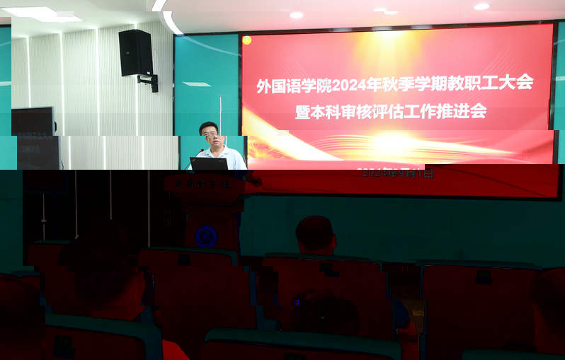 院長岑海兵回顧了學院暑期工作,對上半年工作情況進行總結分析,全面謀劃部署了下半年重點工作。他強調了本科審核評估工作的重要性和緊迫性,就審核評估工作進行再動員、再推進,要求全院教職工提高站位、明确任務,要以本次本科教育教學審核評估為契機,加強内涵建設,推動學院事業發展。會上岑海兵做了以《語言為帆,破浪前行 助力學校國際化進程》為題的報告,系統闡述了外語學科擴點建設規劃,明确了學院中期發展方向。