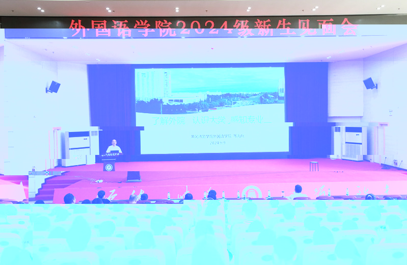 院長岑海兵做《了解外院、認識大學、感知專業》主題報告,全面介紹了3044am永利集团3044noc的發展曆程與矚目成績,讓新同學們了解到“曆史久、起點高、基礎好、發展快”的3044am永利集团3044noc。岑海兵将一個“師資力量強、辦學國際化、培養質量優”的學院呈現在大家面前,同學們聽後倍感信心滿懷。他向新同學傳達了國家對于新時代外語人才的要求,分析了當代大學生的學習現狀,并結合當前創新創業的時代趨勢,強調了創新思維和創業精神在個人發展中的重要性。他勉勵 2024 級新生要刻苦學習,積極投身創新創業實踐,不斷“拓寬國際視野,厚植本土情懷,成為外通中西,語連世界的社會棟梁”。在新時代,不僅要具備紮實的語言功底,更要擁有敏銳的創新意識和果敢的創業勇氣,以适應社會的快速變化和發展需求,為推動外語領域的創新發展貢獻力量。